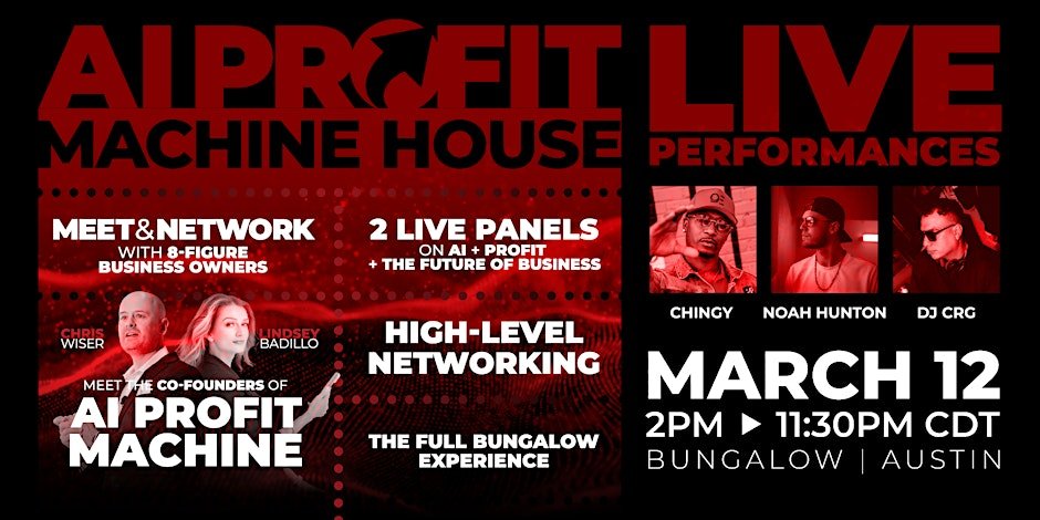 AI Profit Machine House - Live Music with Chingy, Noah Hunton & DJ CRG + AI panels + networking AI Profit Machine House is taking over Bungalow for 2026. This...